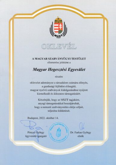 A Magyar Szabványügyi Testület ügyvezető igazgatója és elnöke – október 14., a Szabványosítás Világnapja alkalmából – levéllel és oklevéllel köszönte meg az anyagi támogatásunkat, együttműködésünket és elkötelezettségünket, hogy hozzájárultunk szakterületük szabványainak kidolgozásához.